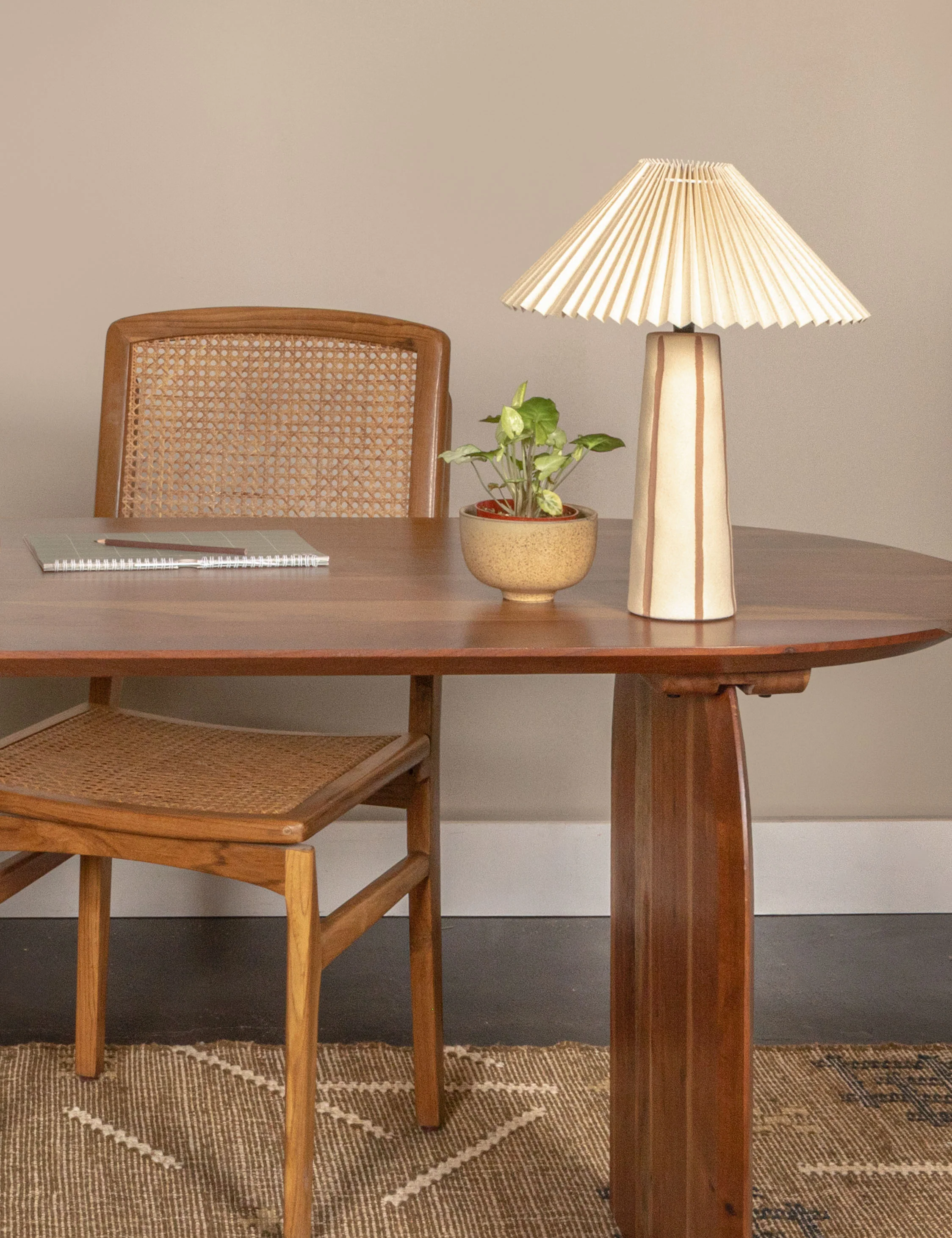 The Baza lamp pairs hand-painted stripes with a pleated shade, offering a warm mix of artistry and refinement. Compact in form, this table lamp layers grounded elegance into a bedroom, entryway, or living space.